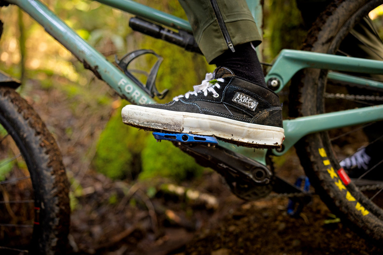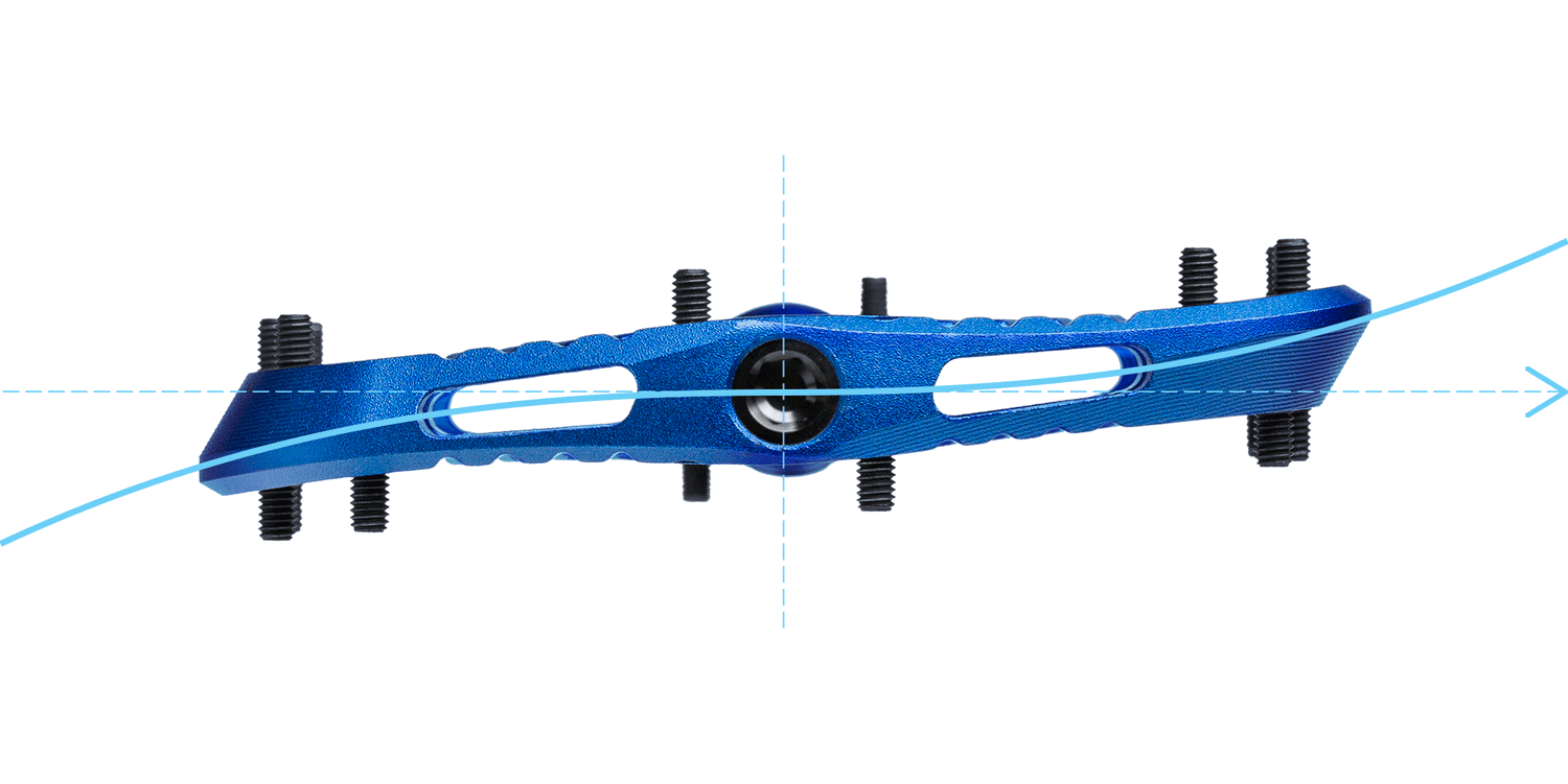 The front half of the pedal is concave and hugs the ball of your foot to give a locked in descending feel, while the convex back half allows your heels to drop when the trail gets rough. Utilizing this new profile keeps your feet exactly where you want them without relying on incredibly long and sharp pins.